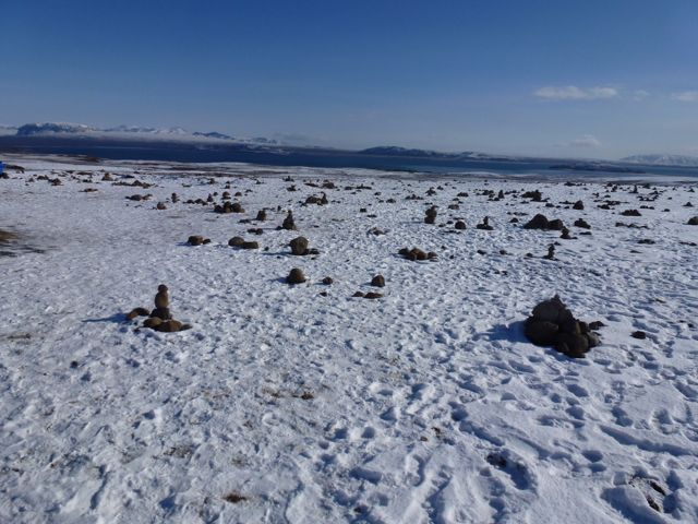 It turns the living earth, and her people, into a maze in a desert. Not all are at home in the world. These new sculptures, echoes of tourism, threaten the environment of the cairns the first settlers laid down, to find their way to each other.