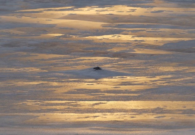Put a human on that track without a big truck to zoom around in and the animal is likely to climb one of those hills to see what it can see. Without a truck as a kind of surrogate thought, roads make humans blind. That’s why they like to make more-or-less straight lines. They follow their eyes, in the front of their heads, which take in straight light, such as here at Asbyrgi, at dusk.