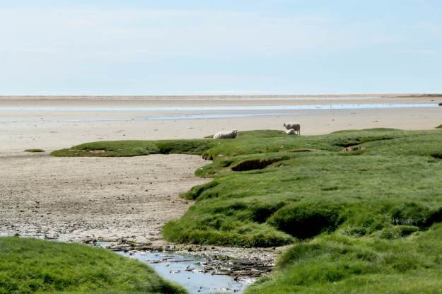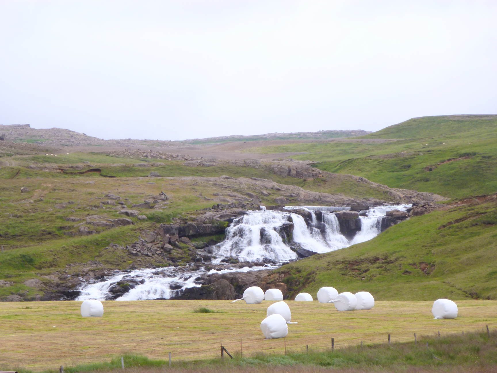 White sheep to the left, white sheep to the right, and white hay up close. They all balance the white of the falls. It maintains visual interest and balance. What is a painting without that, eh!