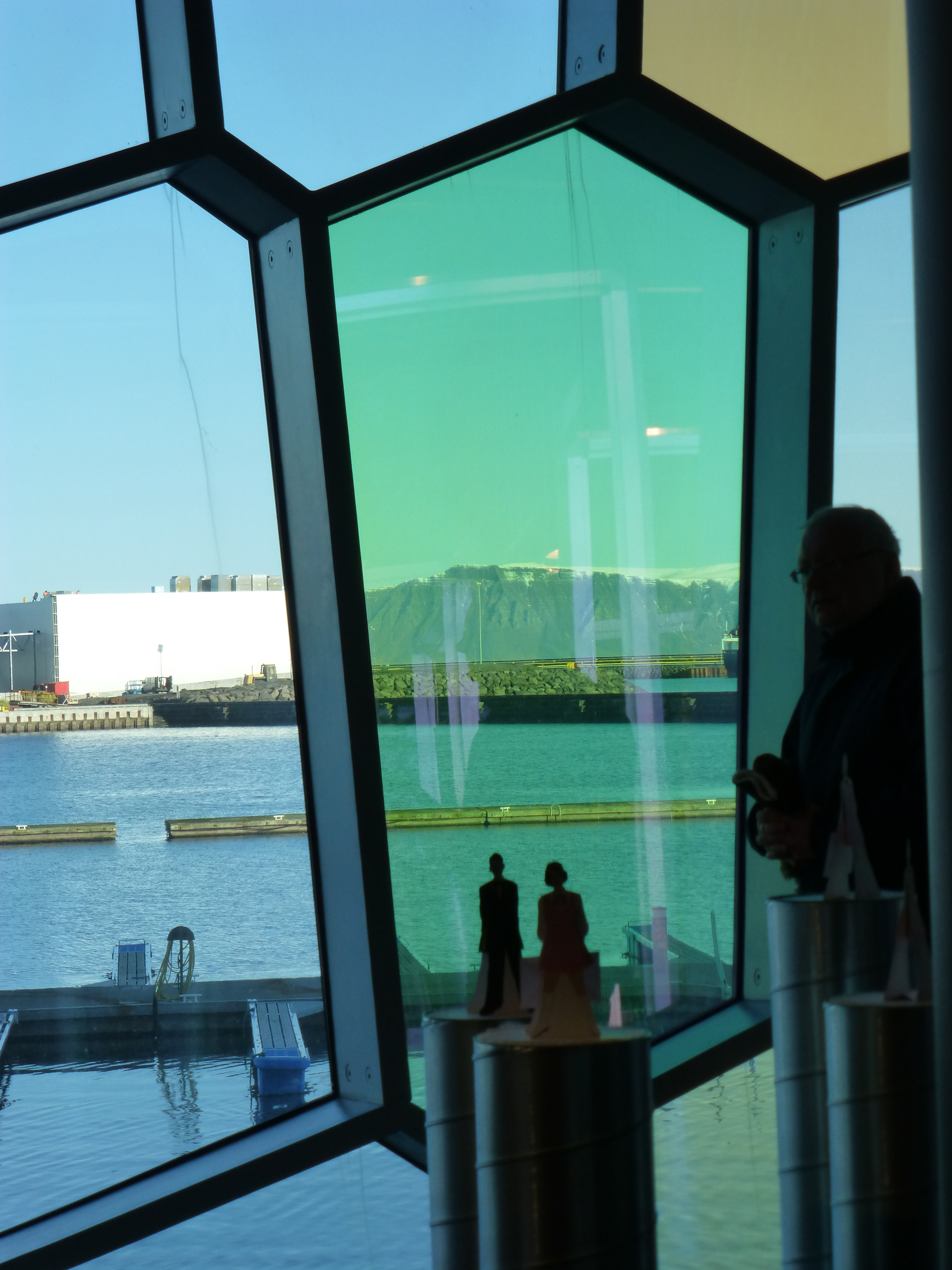 … but tourism survives on images, so the great opera hall, the Harpa, allows anyone to view others as if they are in a faded Polaroid shot from the 1970s …