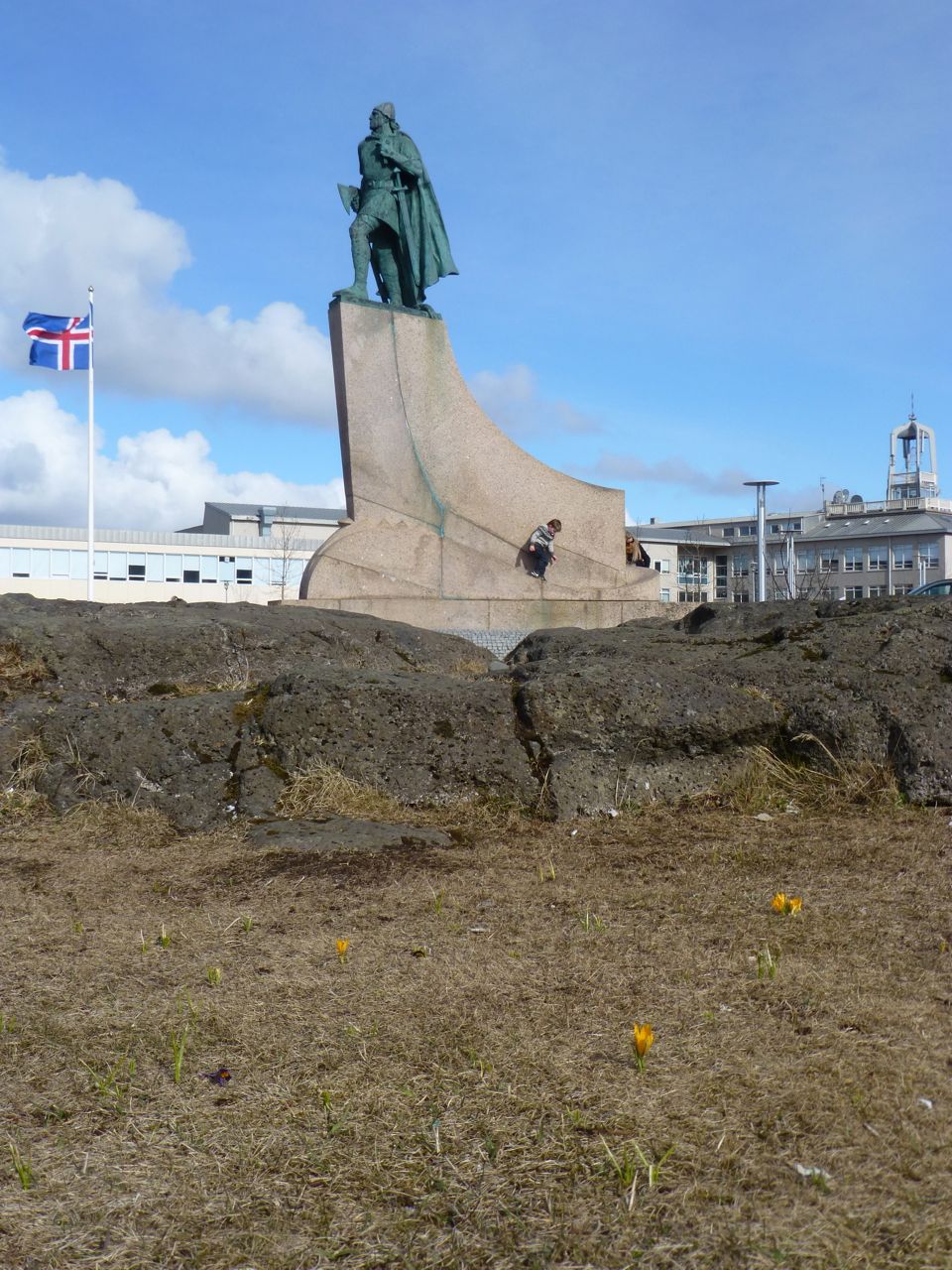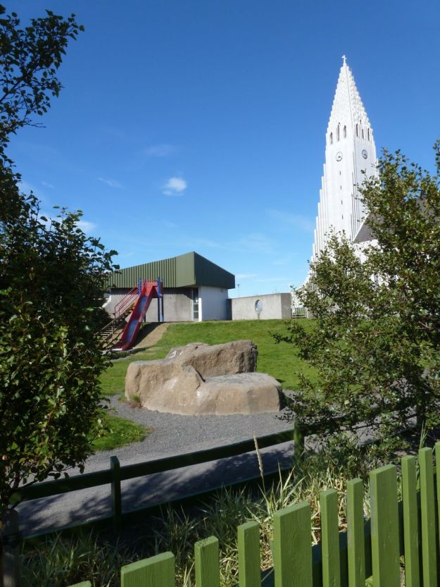 You don’t have to go so far. Right in front of the Hallgrimskirkja in downtown Reykjavik, right under Lief Erickson’s statue, the elves are living happily ever after. Wander around. They’re in every schoolyard in town. But isn’t that right? Shouldn’t kids be playing with elves? Someone should tell the kid below.