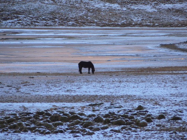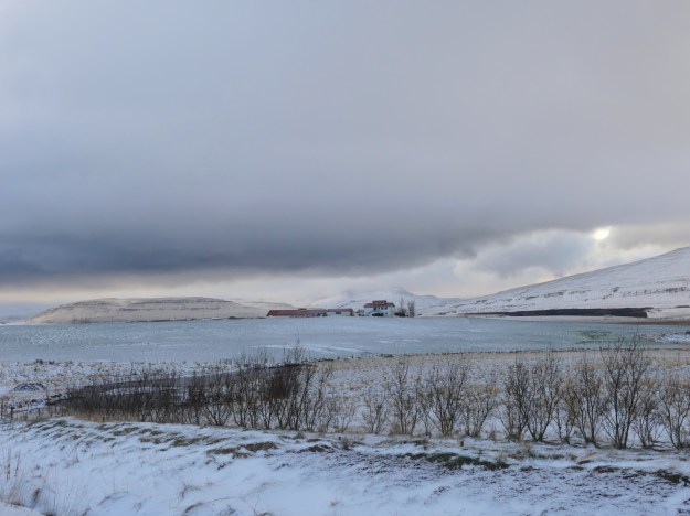 In mid-November, there is no break between sunrise and sunset, just a switch in the spectrum. Here’s the pink morning light at Hafnarskógar, looking up to Hafnarfell.