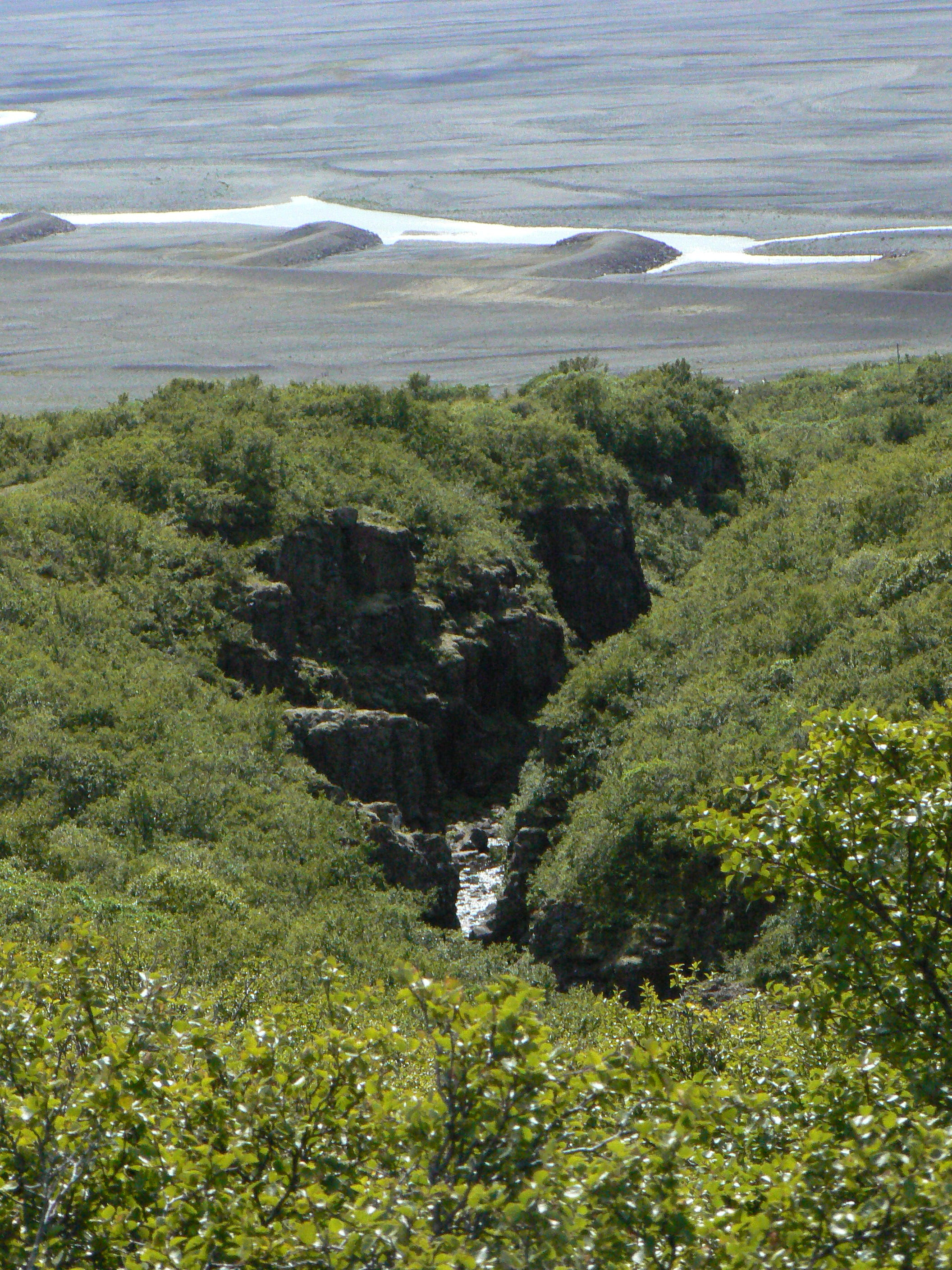 In addition to the deflective butts of rock redirecting Bæjargil as it streams down from Svartifoss, the Black Falls, there’s a troll in the stream bed. There usually is. That’s the spirit of the rock, just as the water-deflecting dikes are in the distance. What? Did someone tell you that trolls are mythological? No, they are us.