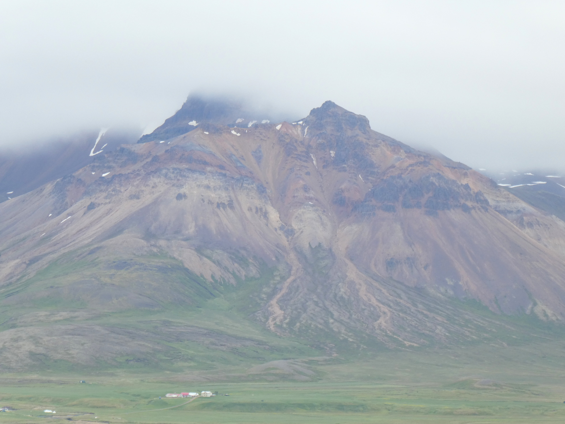 A century ago, most Icelanders were farmers. Now a few thousand remain. Their Iceland is as complex as any other. For instance, the image below shows not only rich hayfields, with some drainage issues not-yet-solved by dredging, but the results of government farm-improvement subsidies (for dredging) that are one of the ways that Iceland keeps farmers on the land. Note the older style of farming in the foreground, with the sheep at pasture on the heath.