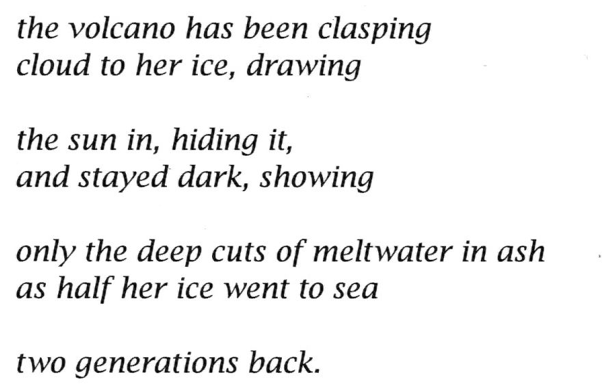 This image shows a strong gale (90 km/h) lifting the cloud away minutes before dusk, the sun coming in horizontally across the sea to the left, striking the ice, and shooting vertically into the cloud, lighting it from below. This moment stars in my poem “Whirlpool” in my book of spells and blessings weaving people and land into a cloth, as the mountain sure does. The poem begins in wind, with its lines snapping apart, barely held to the frame of the loom.