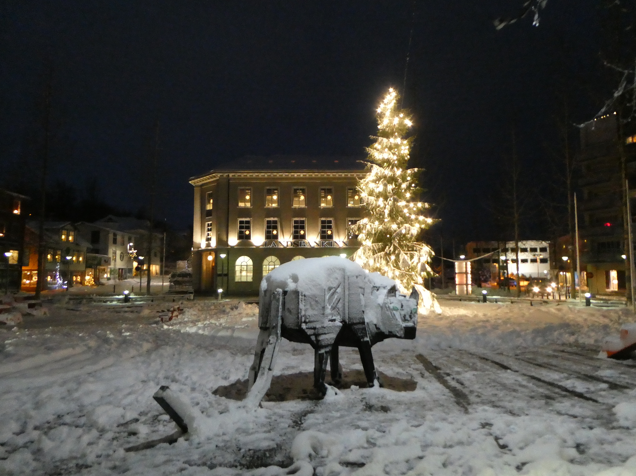 It’s time for the Christmas tree right now outside the Akureyri Art Gallery, but the spring tree waits, covered in blizzard stuff.