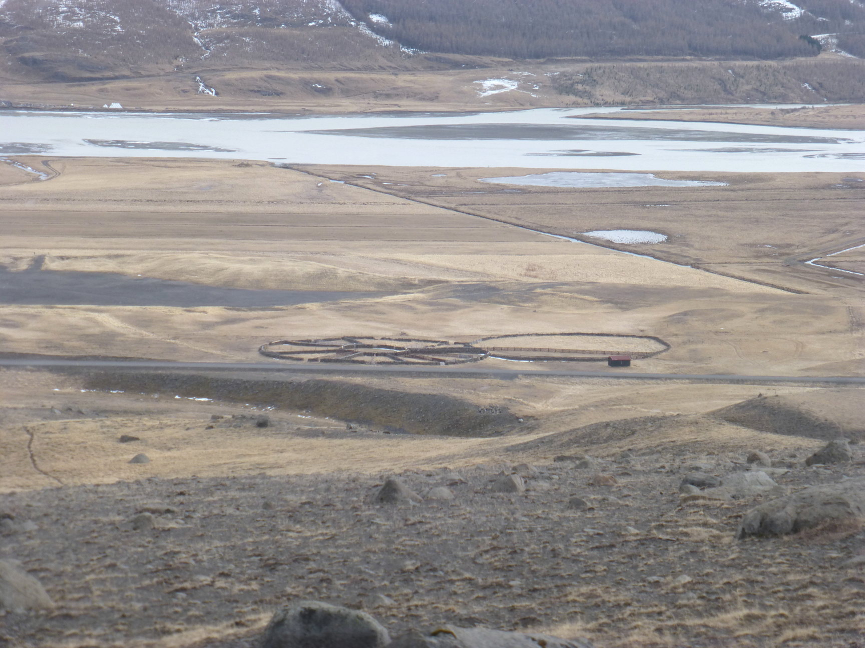 At its foot lies Melárett, the fold that was the largest public building in Iceland in his time, used to gather flocks in winter and separate them out, farm by farm: a place for people to work in unison, come together, and then separate by choice into their own private affairs.
