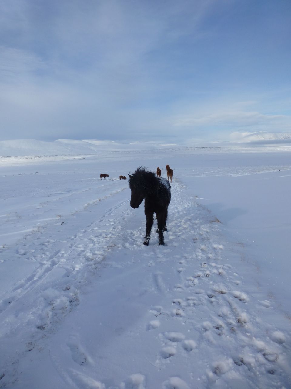 A more useful road gently curves up to the abandoned farm Vaðstakkaheiði, and the waterfall behind it. Lovingly, the road is just called Foss, or “Waterfall”. It’s a great one for bringing the horses in and out, and for going up the hill to service the power lines running under the glacier, but all that is locked off in the winter, which means that you can get to the cliff, and then what? You can practice your confined-space three point turns to go back, or, to really ramp up the fun, reverse your way back to the farm, that’s what, which should keep you laughing all the long night through, when you think about it.