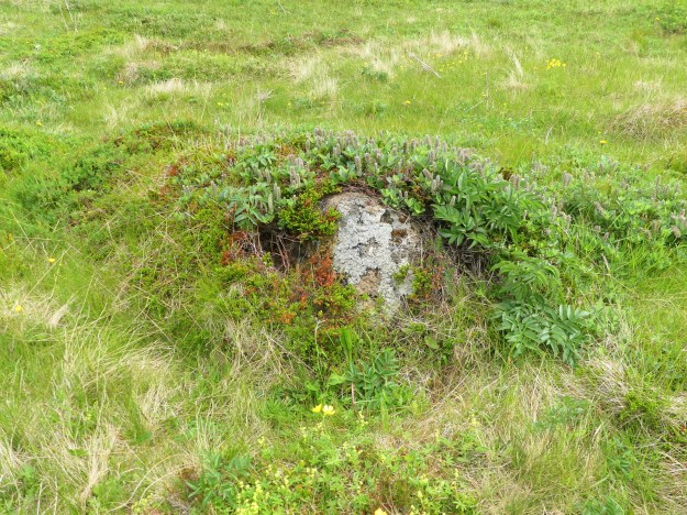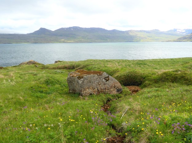 Here’s a stone marked by human tools in Neskaupstaðir. It is broken from the old sea cliff behind me, and lying on the old underwater shelf below. Note, too that it sits in a hollow.
