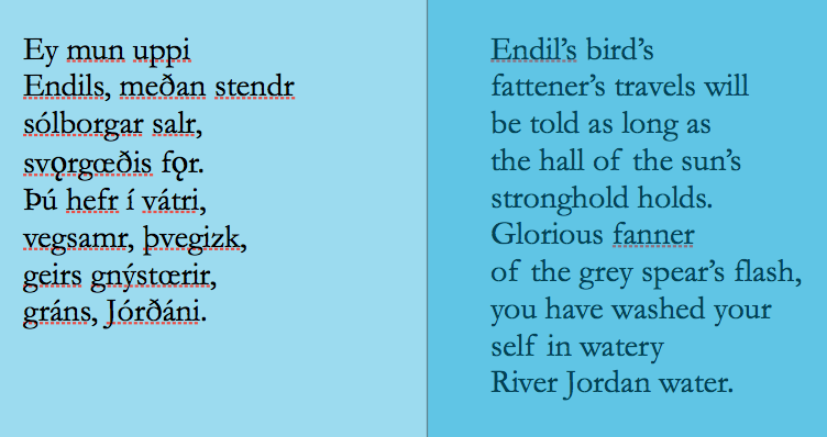The poems are our key. The first form of doubling in a skaldic poem is a kenning. Kennings are natural word forms inherent in Germanic languages (Frisian, Icelandic, Norse, English, Danish, and so on). Speakers of these languages use words like that all the time. Some English examples are: butternut, windowsill, firefly, and doublespeak. In kennings, this tendency is made artful. Each kenning is a miniature poem in itself. Take the land, for instance, such as that forming Iceland. Take a look at the series of kenning’s below. The earth is cleverly hidden with them, or perhaps cleverly revealed. The delight in recognition is part of the magic of the poem. Can you find the earth there, in its sea? (The translation [mine] is loose, to try to catch some of the music, but it’s not wildly off track, or at least not enough to hide the earth any more than it already is.)
