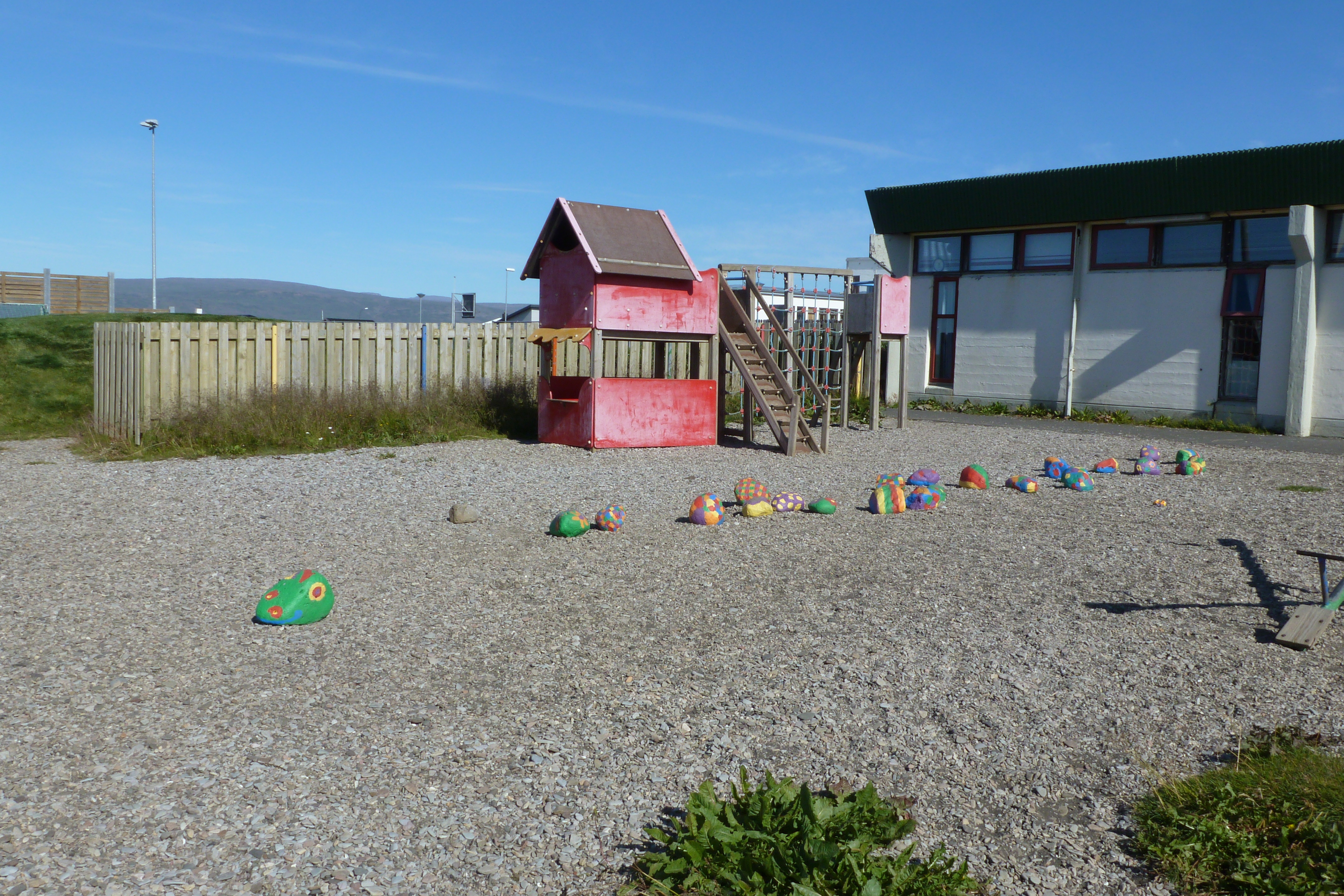 I love this kindergarten playground. Rocks that Icelandic kids have coloured, that they can cart around, roll around, or trip over as they make the monster any way they wish. How splendid!