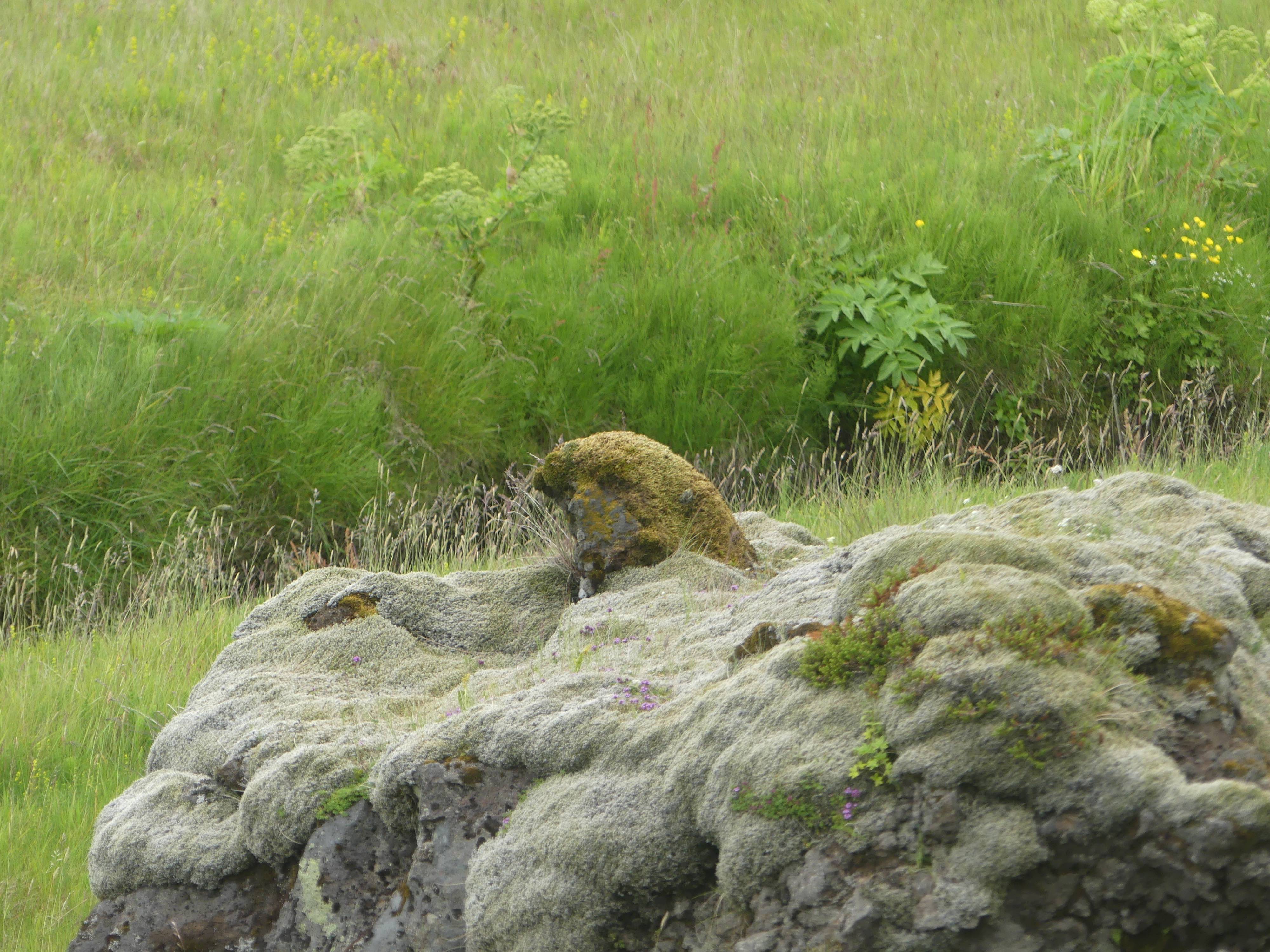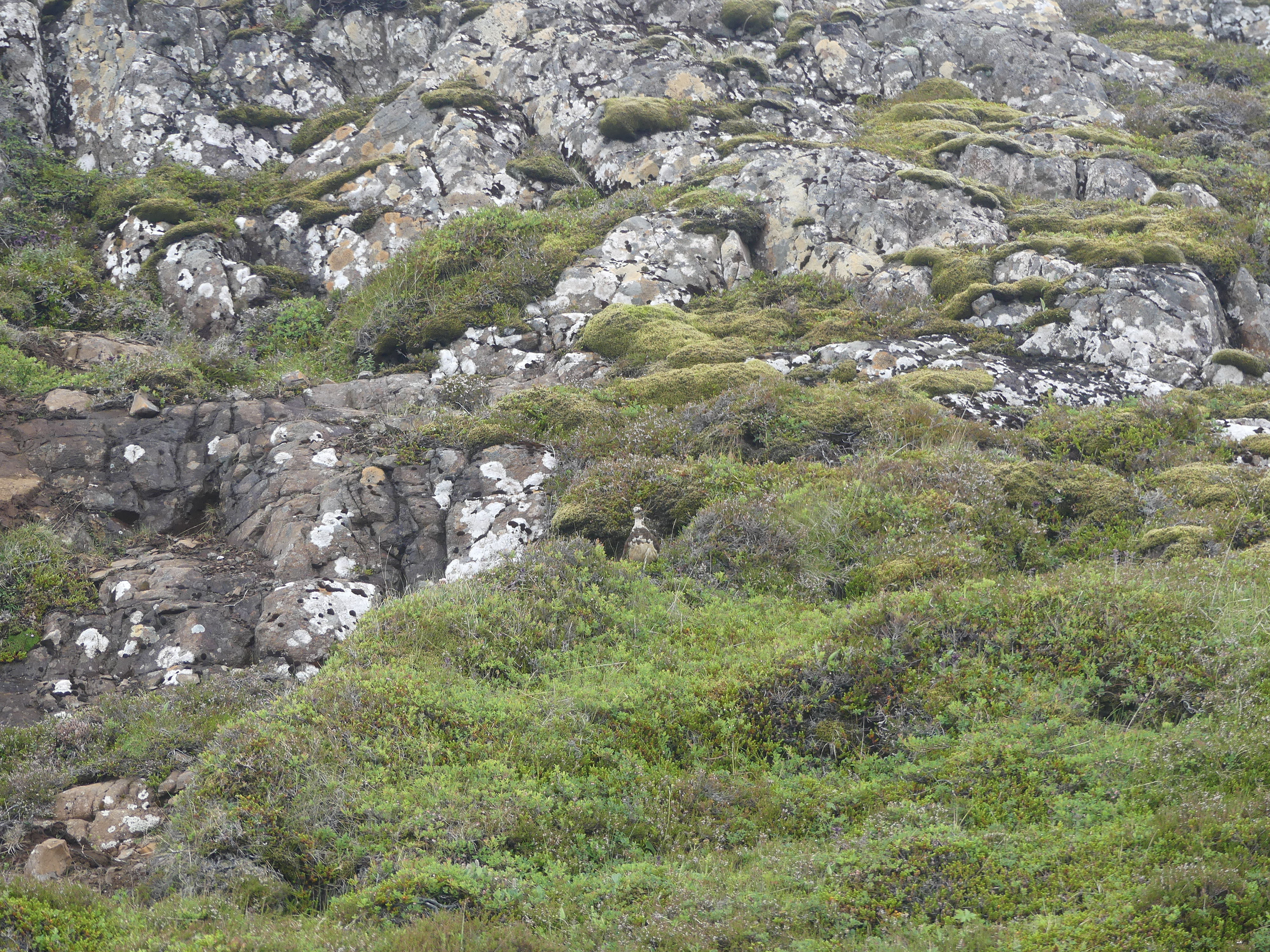 And then they burst up in front of you, from like 20 cm away, and are gone. The trick to disappearing is to remain absolutely still. It didn’t quite work for the one above, which tried to sneak between the cover of two rocks and wound up freezing on the shore grass beside the trail. The one below got it right, though. Safe among the lava lumps.